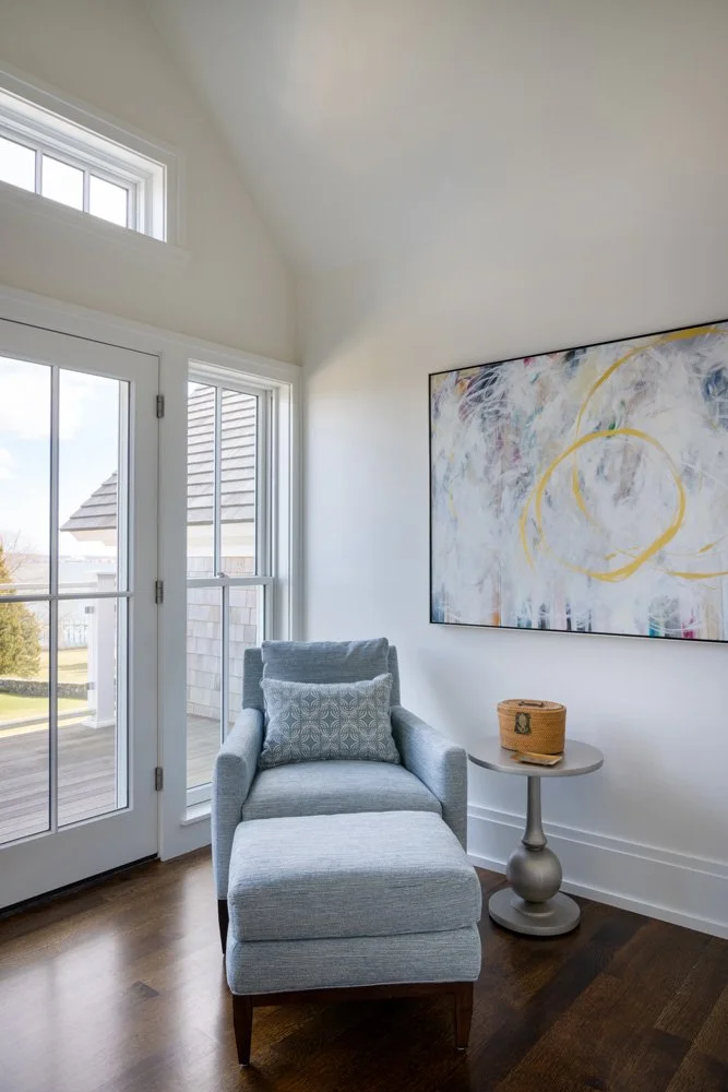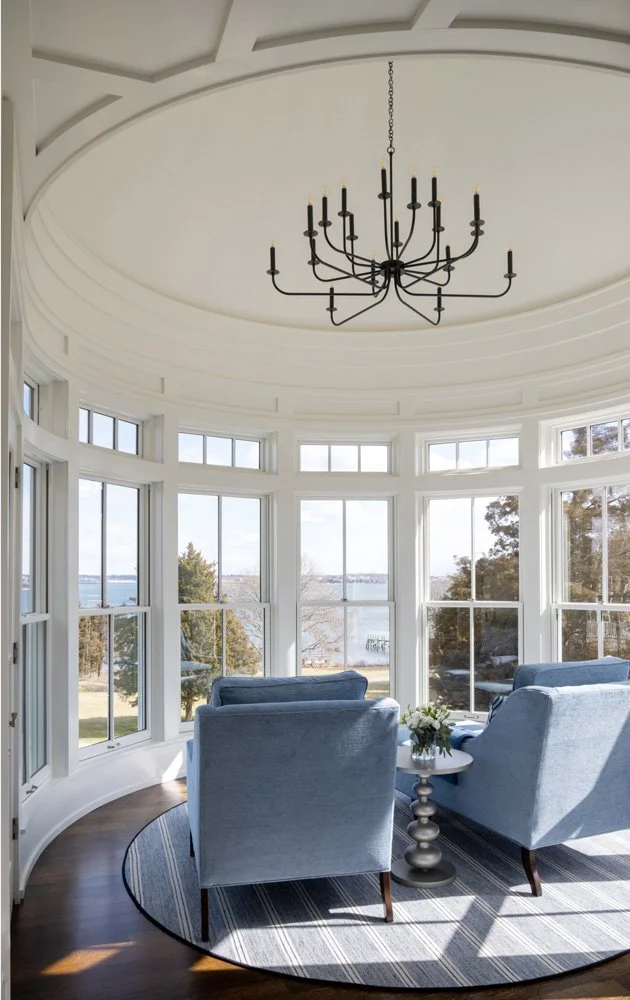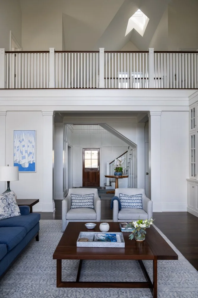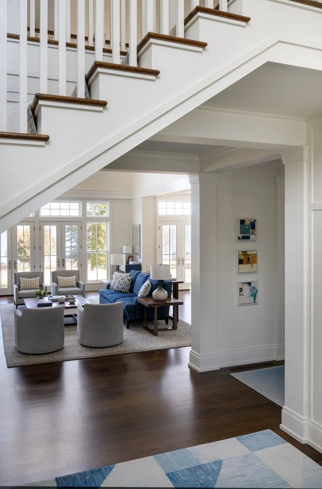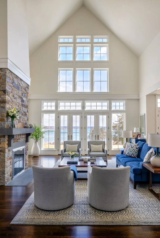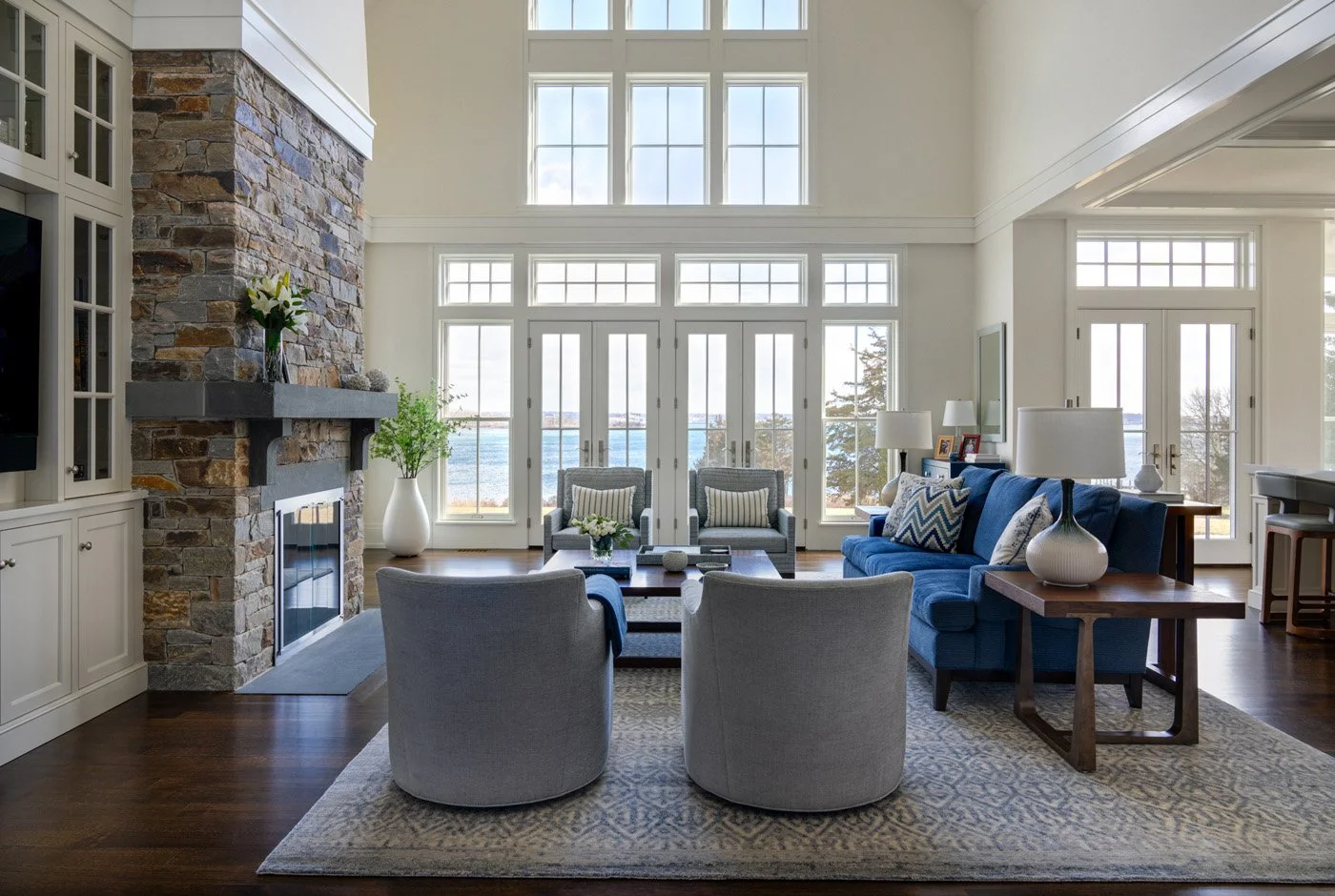 This custom built transitional home along the Narragansett Bay in Rhode Island needed to have the warmth and ease of living of the owners past homes but also function as their new forever home with the spirit of Coastal living throughout.