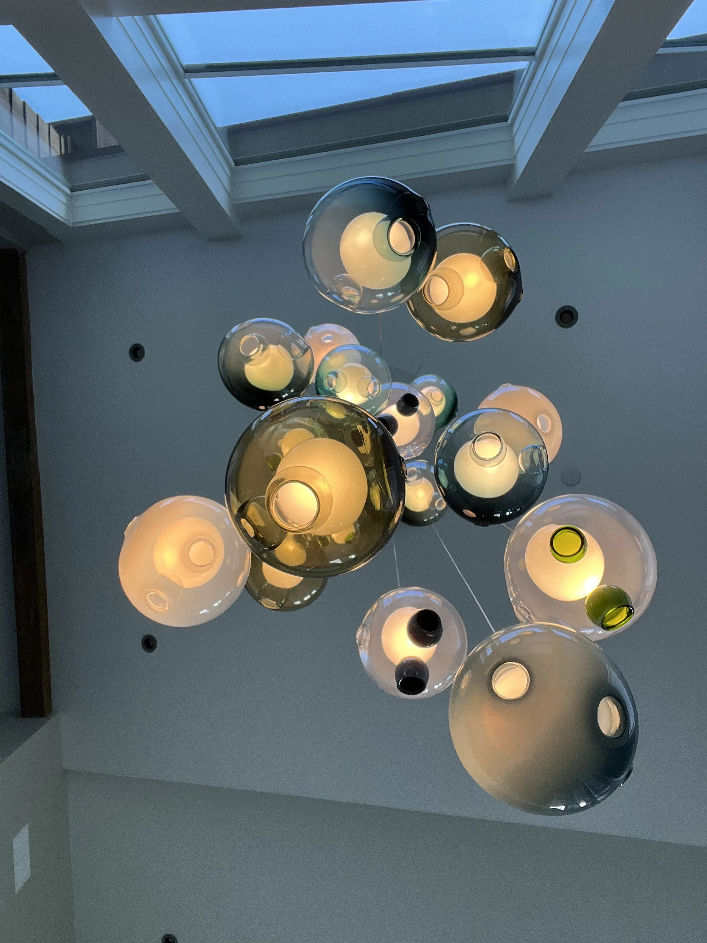 The double height Living and Dining room are the heart of the residence is the perfect place to watch the seasons change. All beneath the custom Bocci light fixture.